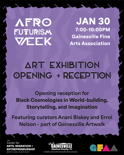 Opening reception for our third annual Afrofuturism art exhibit. Co-curated by Anani Blakey and Errol Nelson, this year’s theme, “Black Cosmologies in World-building, Storytelling,” and Imagination, explores the magical essence of fantasy, visions, and futures. Part of Gainesville Artwalk. Exhibition will be open during GFAA gallery hours until February 20, 2026