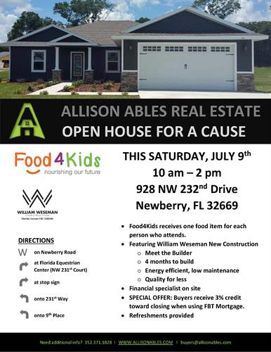 Let’s all do our part to end local child hunger. Allison Ables Real Estate will donate one food item to Food4Kids for every person who attends our WILLIAM WESEMAN NEW CONSTRUCTION OPEN HOUSE FOR A CAUSE.