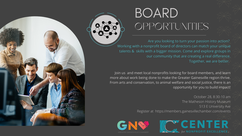 The Greater Gainesville Chamber of Commerce and The Center for Non-Profit Excellence have partnered to provide you with a morning networking opportunity like no other! Join us and meet local non-profits that are looking for board members and learn more about the work being done to make our Greater Gainesville region thrive. From arts & conservation, to animal welfare & social justice, there is an opportunity for you to build an impact!