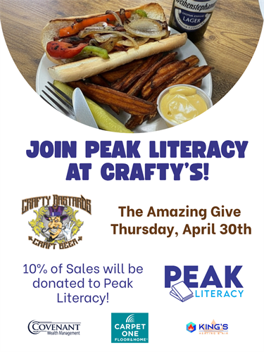 Dine & Donate for Literacy brings the community together at Crafty Bastards in support of PEAK Literacy during The Amazing Give. Throughout the day, 10% of proceeds will be donated to help expand tutoring programs and support local youth becoming confident, independent readers across our community.