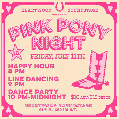 Whether you're dusting off your boots or just in it for the fringe and fun, Pink Pony Night is for everyone. Come cute. Come country. Come ready to dance.
