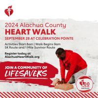 [Gainesville, August 15, 2024] — Nine out of 10 people who suffer cardiac arrest outside of the hospital die, and CPR, especially if performed immediately, can double or triple survival rates. That is why the American Heart Association, celebrating 100 years of lifesaving service, is broadening efforts to empower companies in Alachua County to become champions of CPR through the annual Heart Walk campaign.